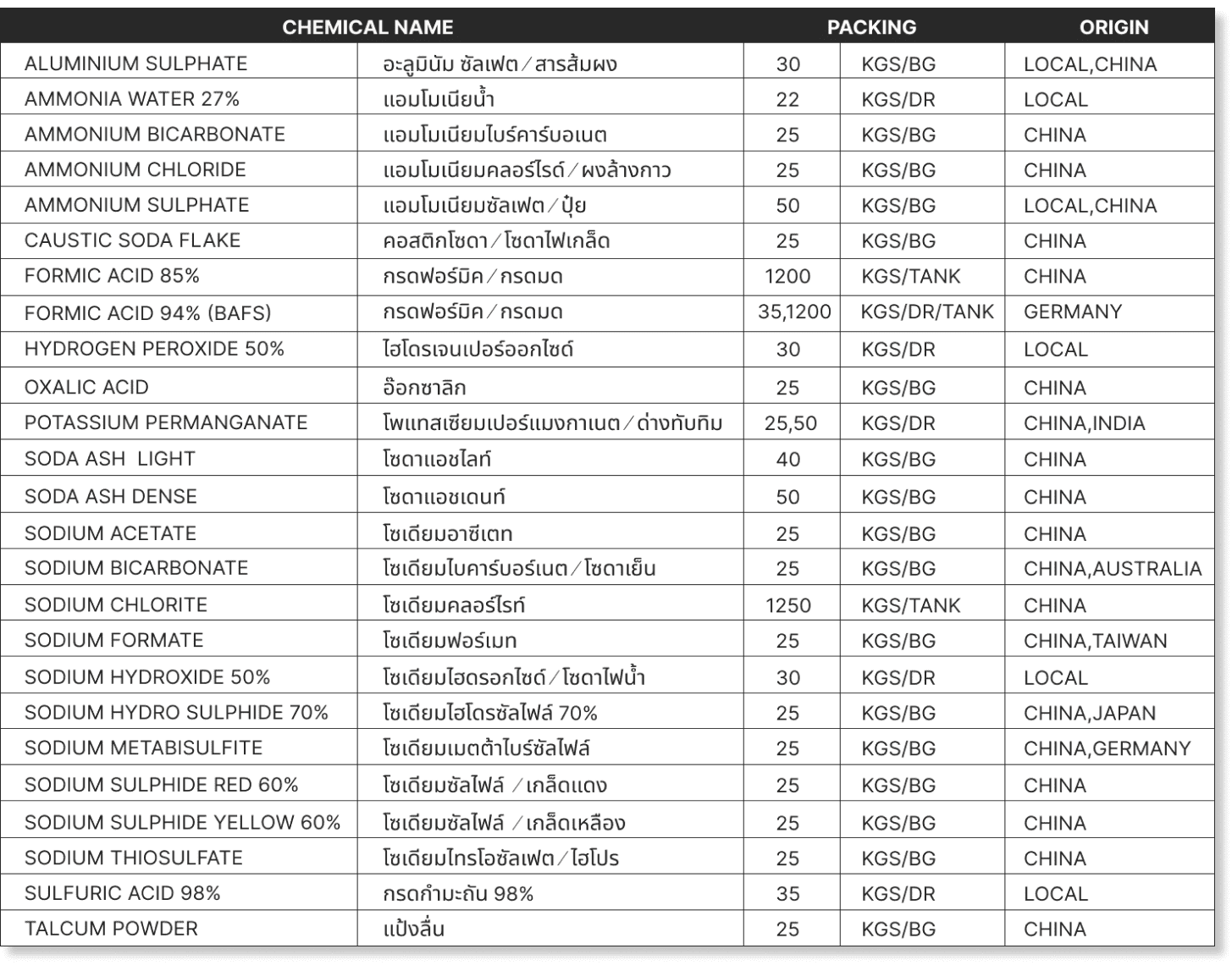 ประกอบธุรกิจนำเข้าและจัดจำหน่ายเคมีภัณฑ์สำหรับลูกค้าในกลุ่มอุตสาหกรรมร่วมทั้งกลุ่มลูกค้าทั่วไป ทางเรานำเข้ามาจากประเทศ จีน,เยอรมัน,อินโดนีเซีย,ญี่ปุ่น และออสเตรเลีย รวมถึงเป็นตัวแทนจำหน่ายเคมีจากโรงงานผู้ผลิตภายในประเทศ